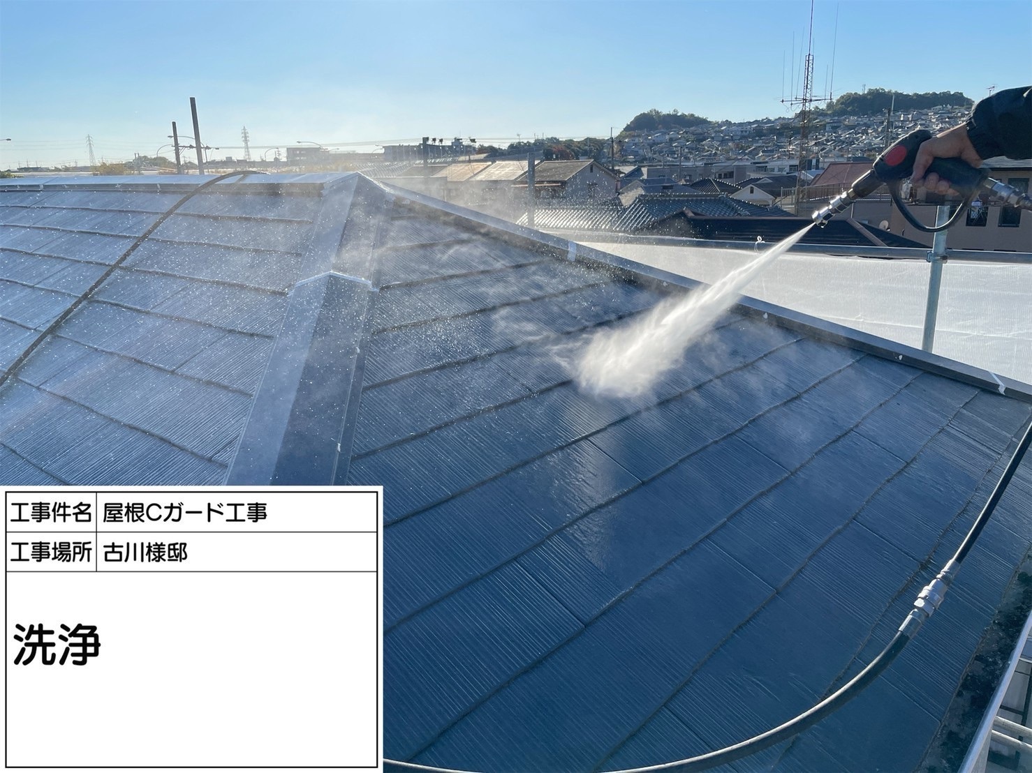 足場が完成したら、屋根塗装前の準備として高圧洗浄を行います!