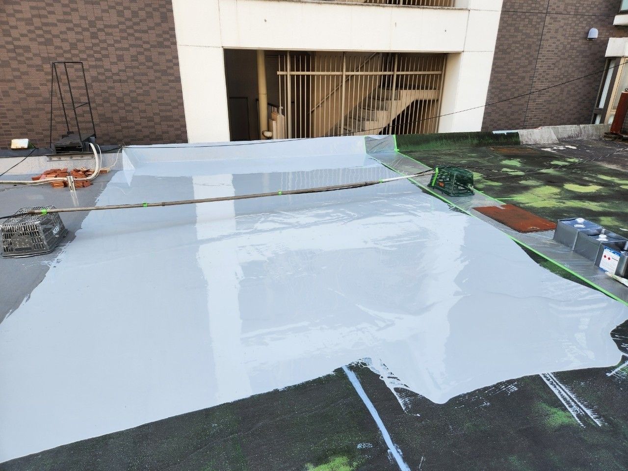 今回は、屋上防水トップコートの中塗り・上塗りを施工しました。