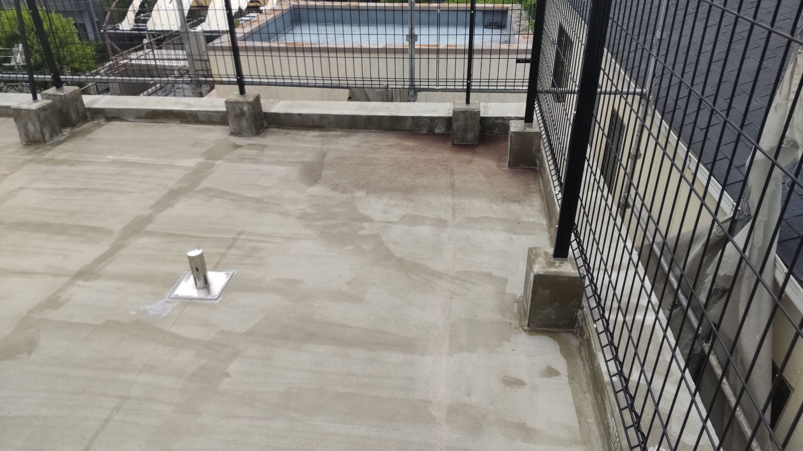 このような場合、まず高圧洗浄とバイオ洗浄によって既存の汚れやコケを除去したのち、プライマー塗布→防水層形成→トップコート仕上げという手順でのウレタン塗膜防水工事が効果的です。また、立ち上がり部分や笠木との取り合い部の処理も丁寧に行う必要があり、シーリング材の選定と施工には特に注意が必要です。