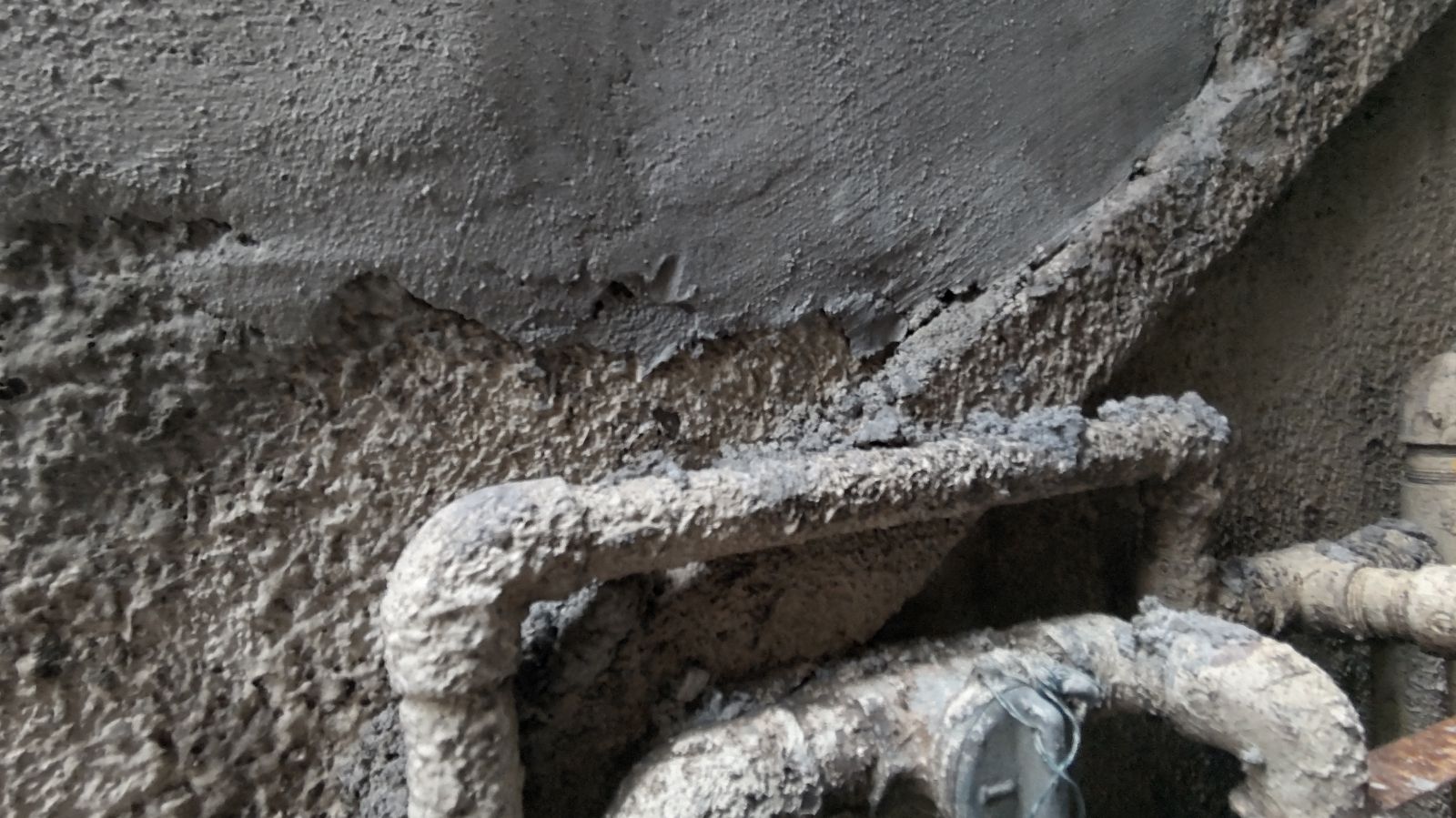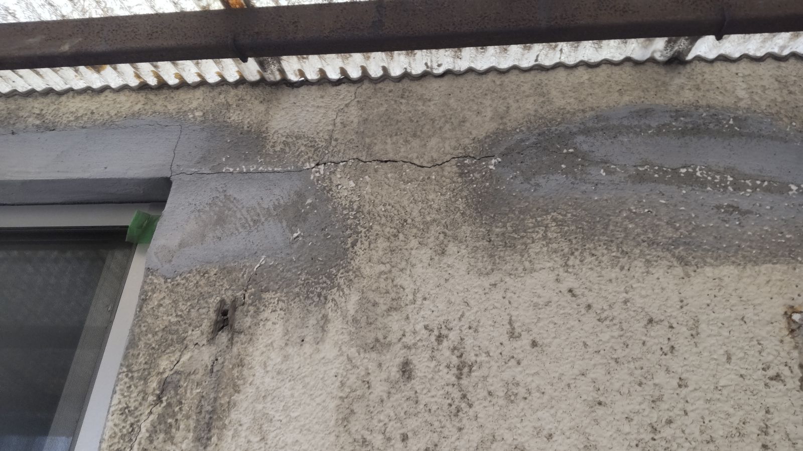 まず外壁の状態を確認すると、ひび割れや剥離が複数箇所で発生しており、特に窓枠周辺のモルタル部分にはクラックが目立ち、雨水の侵入リスクが高い状態でした。また、配管周りの外壁では補修跡が雑に施工されており、防水性が十分とは言えない状況でした。
