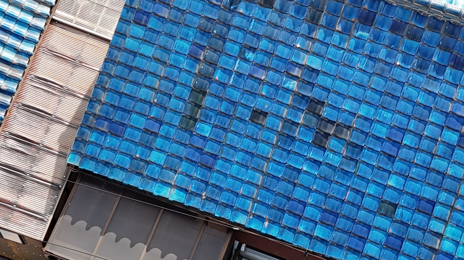 まずはドローンを使用して屋根全体を確認しました。写真からも見て取れるように、青いスレート屋根には経年劣化による褪色や色ムラ、コケの発生が顕著で、特に南面では防水機能の低下が見られました。屋根材の割れや欠損はありませんでしたが、表面の塗膜が限界を迎えていることから、今回はラバー工事(高弾性塗料による再塗装)が必要です。