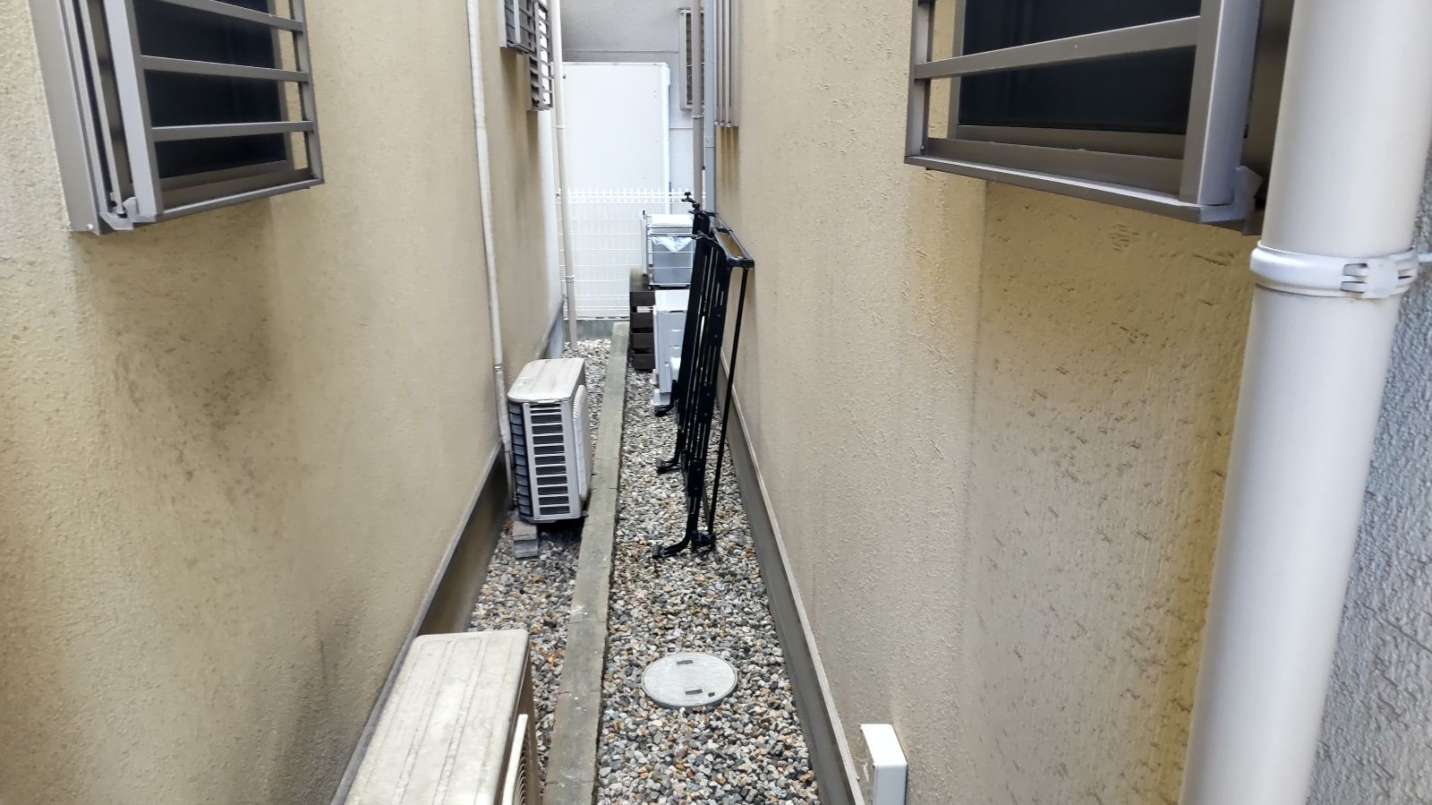 サイディングの目地部分では、シーリング材が劣化して隙間が生じており、そこから水分が侵入することで外壁材の内部劣化につながる恐れがありました。また、外壁に沿った通路部分では、室外機や配管が密集していることから、塗装時には養生と作業スペースの確保が重要であると判断しました。
