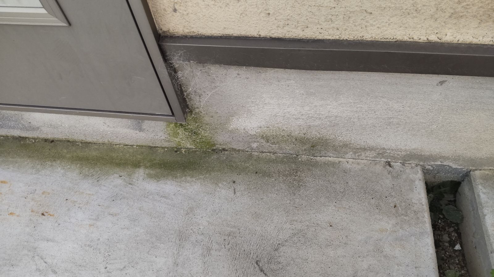 さらに、北面や日陰となる基礎部分では、緑色のコケや藻の繁殖が進行中。勝手口下のコンクリート部は常に湿気がこもり、排水性の悪さが露呈していました。これは通風の悪さと、雨水が溜まりやすい傾斜が関係しています。