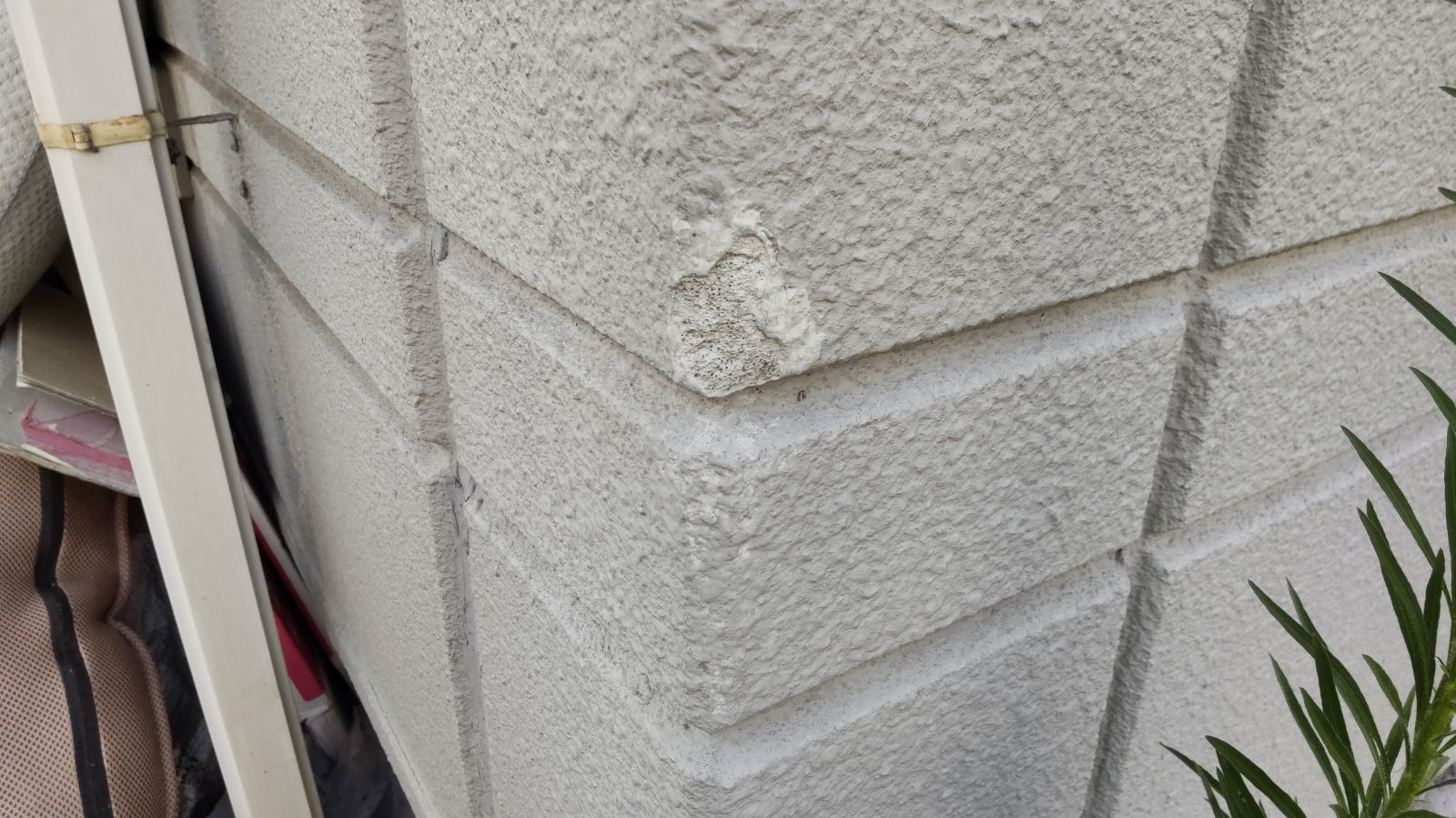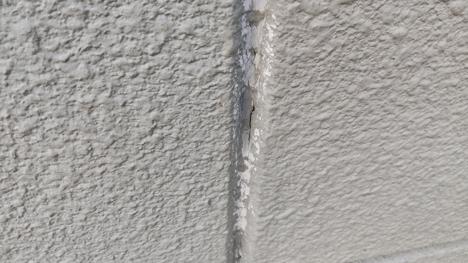建物の角部分では塗膜の剥がれが確認されました。外壁を指でなぞるとチョーキング現象(白い粉がつく状態)も顕著で、紫外線や風雨による塗膜の劣化が進行していることがわかりました。目地部分のシーリング材が硬化しひび割れを起こしており、防水性が大きく損なわれている状態です。