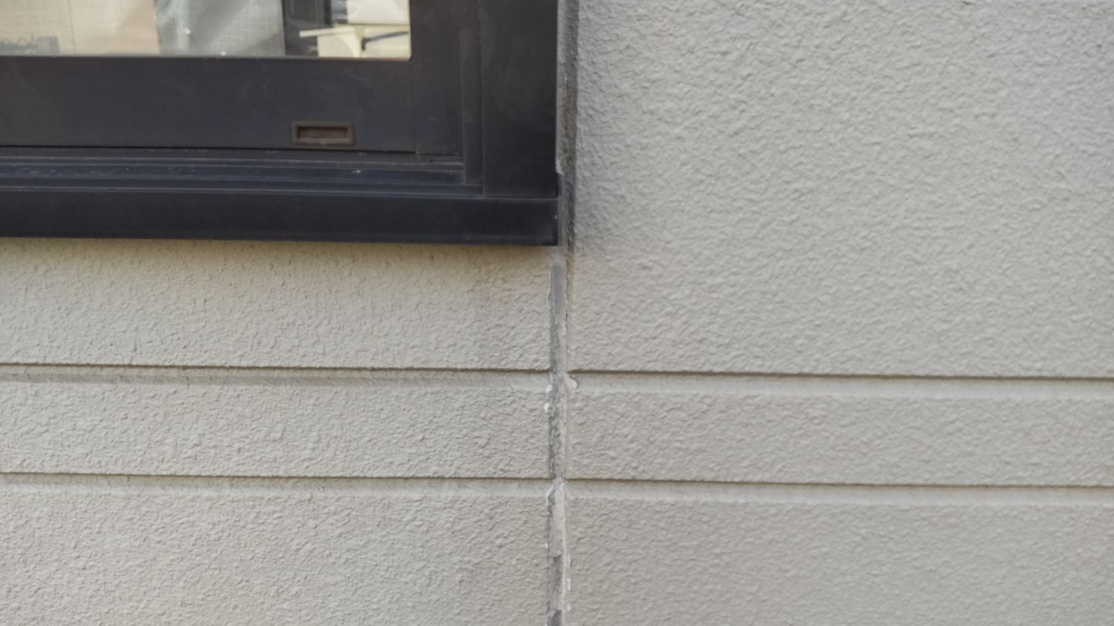 目地部分のシーリング材(コーキング)の劣化は、外壁全体の中でも重要なチェックポイントの一つです。今回の調査では、目地の多くでシーリングが硬化し、写真のように縦に裂けるようなひび割れが複数確認されました。特に窓周りの隙間は要注意で、雨風が直接当たりやすいため、劣化が進みやすい部位です。