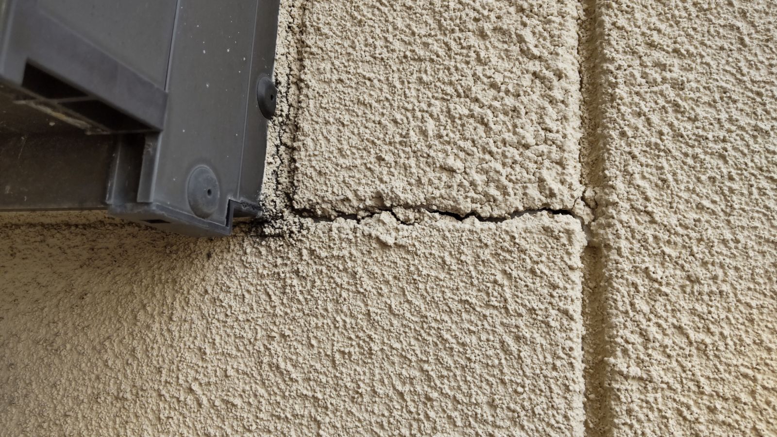 また、窓まわりや外壁の継ぎ目部分には深いクラック(亀裂)が確認できました。写真の通り、一部のクラックは目地材が収縮し、構造部まで達する可能性もありました。このような箇所には、しっかりと下地処理を行い、弾性のあるコーキング材での補修が必要です。