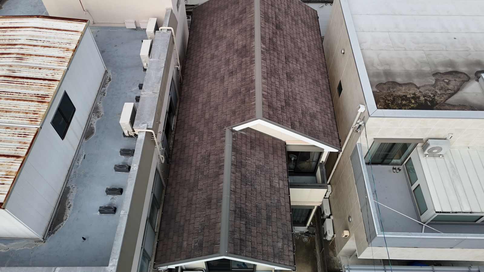屋根は築20年以上が経過しており、スレート材の劣化が進行していました。特にドローン撮影からは、屋根全体にうっすらと苔が広がっており、これが雨水を保持しやすくしているため、素材の劣化がさらに早まる状況でした。また、スレートの反り返りも複数箇所で見られ、強風や大雨の際に飛散や雨漏りの原因になる危険性があります。