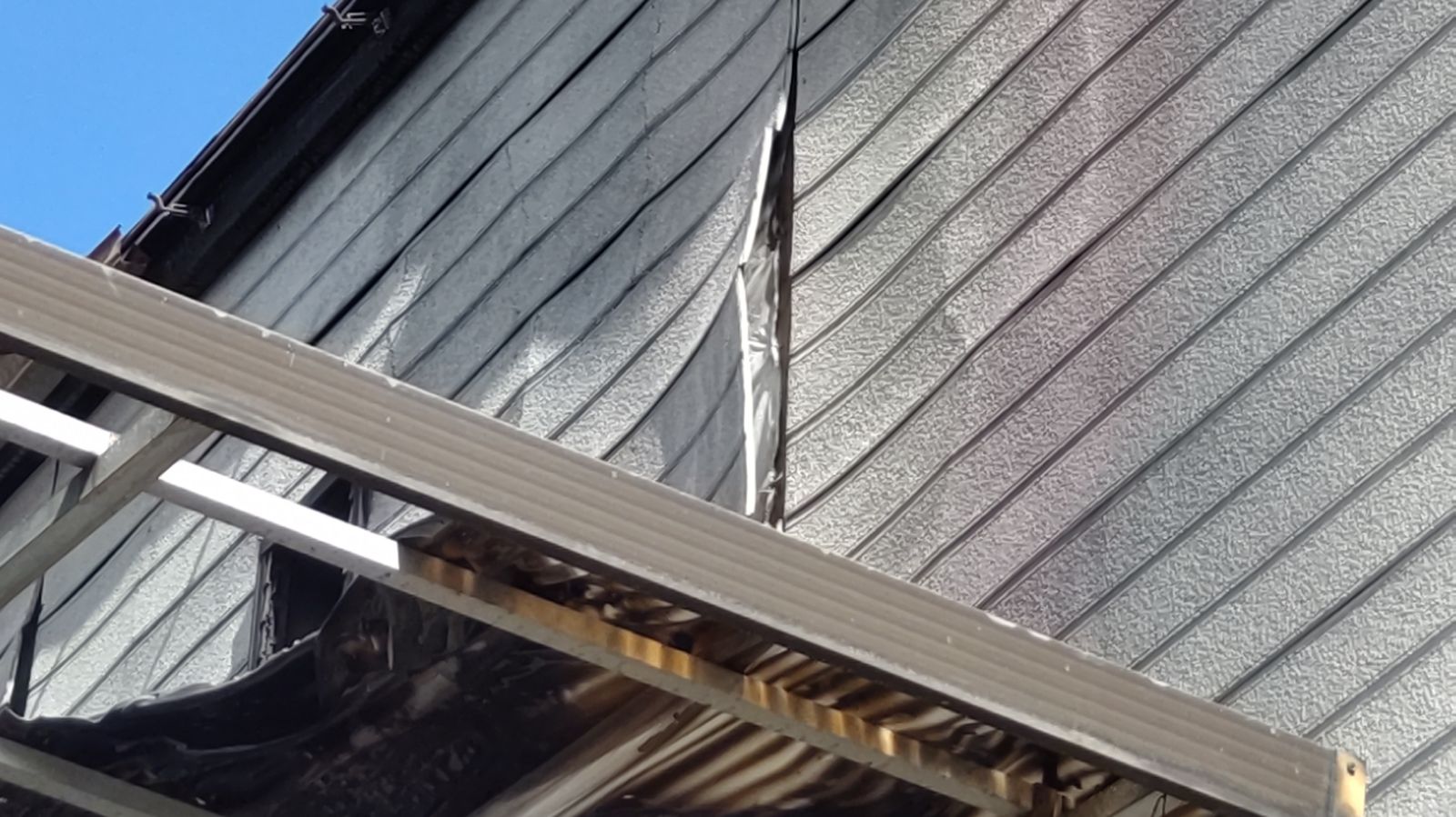 さらに、外壁材自体が反って内側から浮き上がっており、金物の固定力が失われている可能性が高いと判断しました。調査中にはサイディングの目地から内部下地の木材が見える箇所もあり、雨水の侵入による構造部へのダメージが心配されます。
