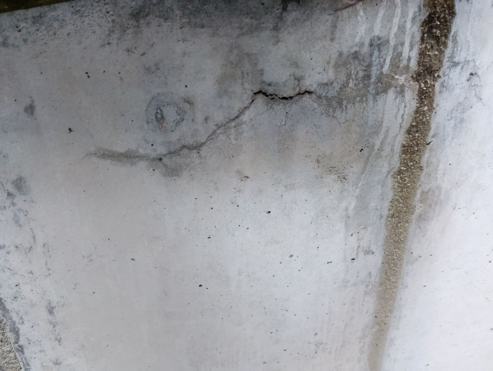 まずは梯子を設置し、屋根へ上がらせていただきました。外壁の一部にひび割れと汚れの付着が確認できました。クラック自体は構造に直結する大きなものではありませんが、塗膜の劣化により防水性能が落ちているサインです。雨だれの跡も見られ、長年の風雨の影響が蓄積している状態でした。