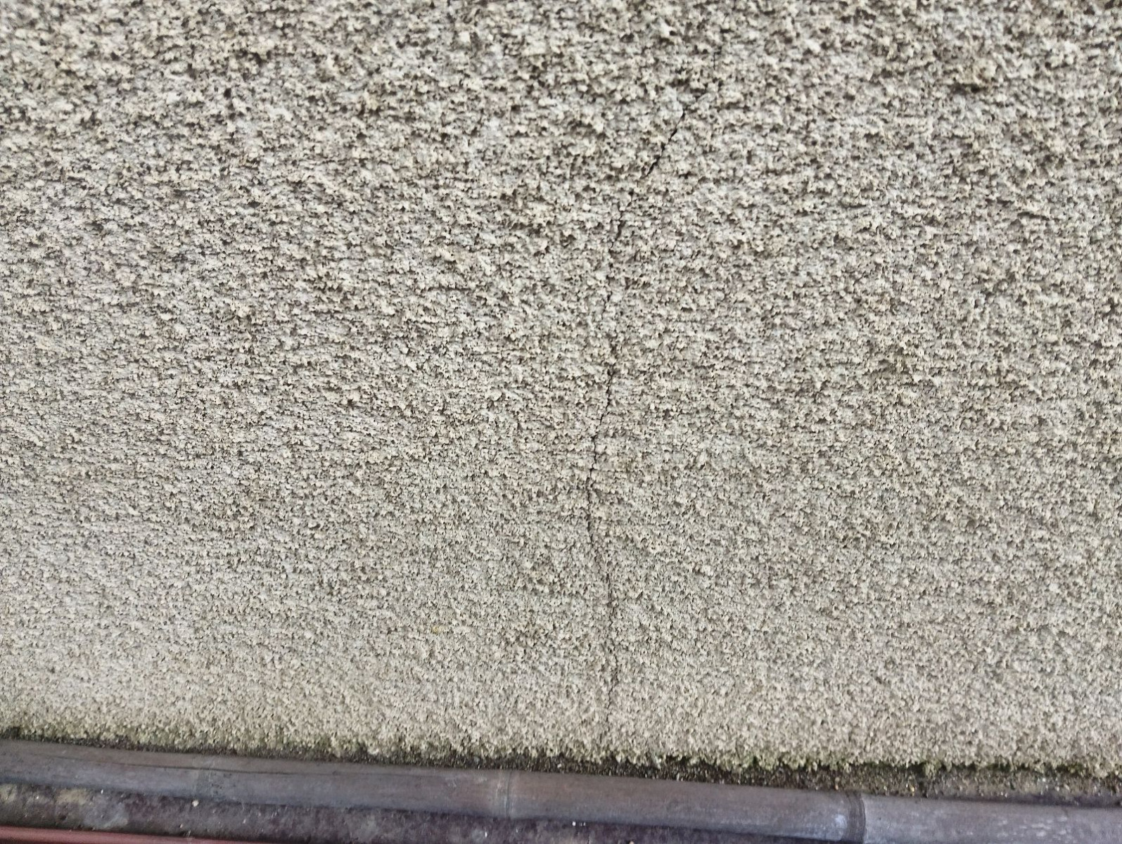 今回の大阪府枚方市小倉東町での外壁現地調査では、モルタル外壁特有の経年劣化症状が確認できました。特に目立っていたのは、縦方向に走るヘアークラックです。ヘアークラックは一見すると細く軽微に見えますが、外壁塗装の防水機能が低下しているサインでもあります。塗膜が劣化すると弾性が失われ、外壁の動きに追従できなくなるため、このような細かなひび割れが発生します。