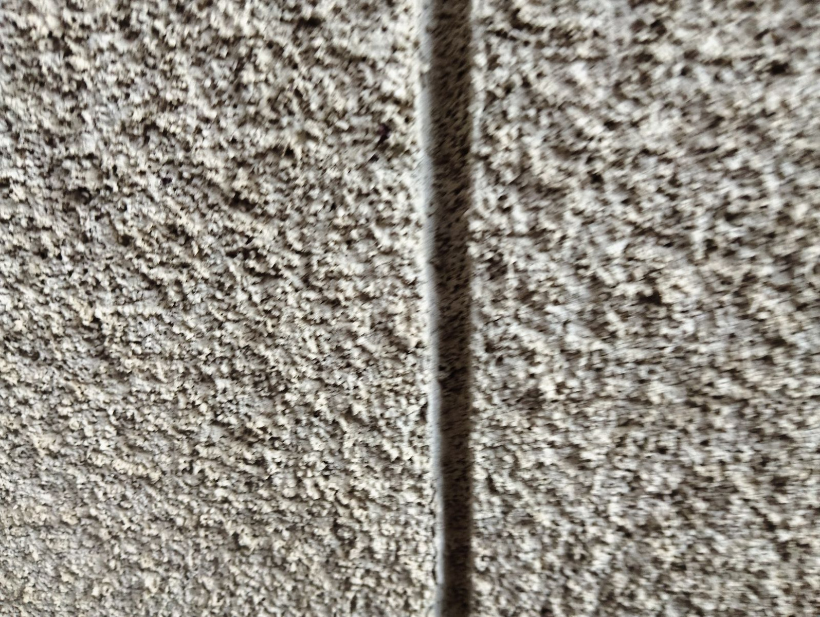 まず建物全体を目視で確認したところ、外壁表面に経年劣化による色あせが見られました。添付写真の通り、モルタル外壁特有の凹凸仕上げ部分に汚れの付着が確認できます。また、縦方向に入ったヘアークラック(細いひび割れ)も確認できました。幅自体は大きくありませんが、このまま放置すると雨水が内部へ浸入するリスクが高まります。さらに、外壁の目地部分にも劣化が見られ、シーリング材の硬化が進んでいる状態でした。