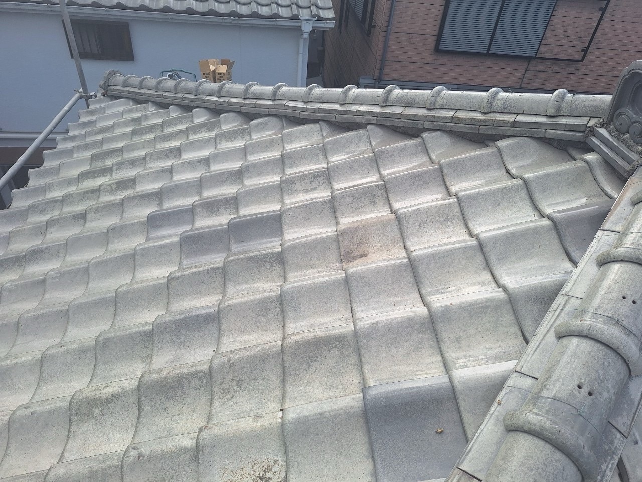 また、写真からも分かるように、屋根表面に苔や黒ずみが広範囲に発生しており、これは湿気が溜まりやすく、太陽光が当たりにくい環境でよく見られます。苔は根を張って瓦を浮かせたり、目地を侵食したりするため、見た目以上に深刻な問題です。