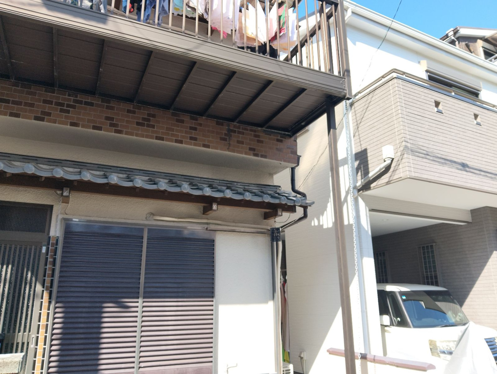 今回、私たちは大阪府枚方市津田西町にお住まいのお客様から「ベランダ下部の壁が剥がれているようなので見てほしい」とのご相談をいただき、現地調査に伺いました。現場には車で向かいましたが、周囲は一戸建て住宅が建ち並ぶ落ち着いた住宅街で、道幅もやや狭め。駐車位置を工夫しつつ、お客様のお宅に到着しました。