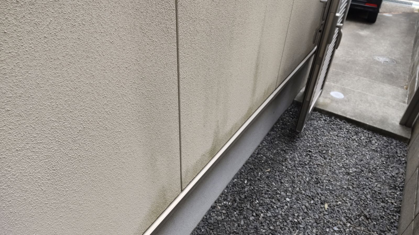 また、基礎周辺の外壁には雨だれ汚れや黒ずみがはっきりと確認できました。これは外壁塗膜の撥水機能が失われている証拠で、放置すると基材そのものの劣化を早めてしまいます。