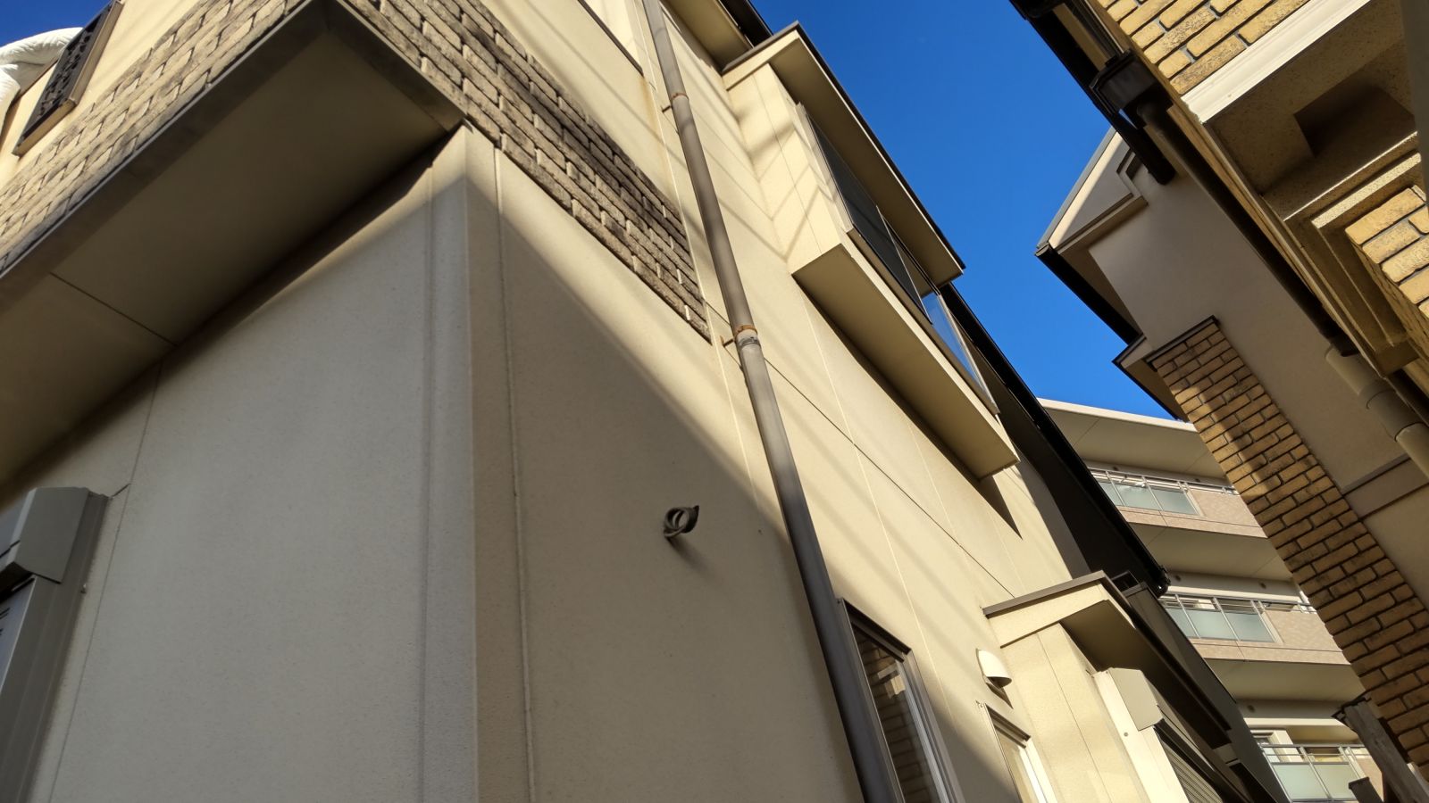 お住まいは3階建ての戸建住宅で、両隣に隣接住宅があり、採光や通風に若干の制限がある典型的な都市型住宅です。建物は築15年程度と見られ、ぱっと見では綺麗に見えますが、近くで観察すると劣化のサインが随所に見られました。