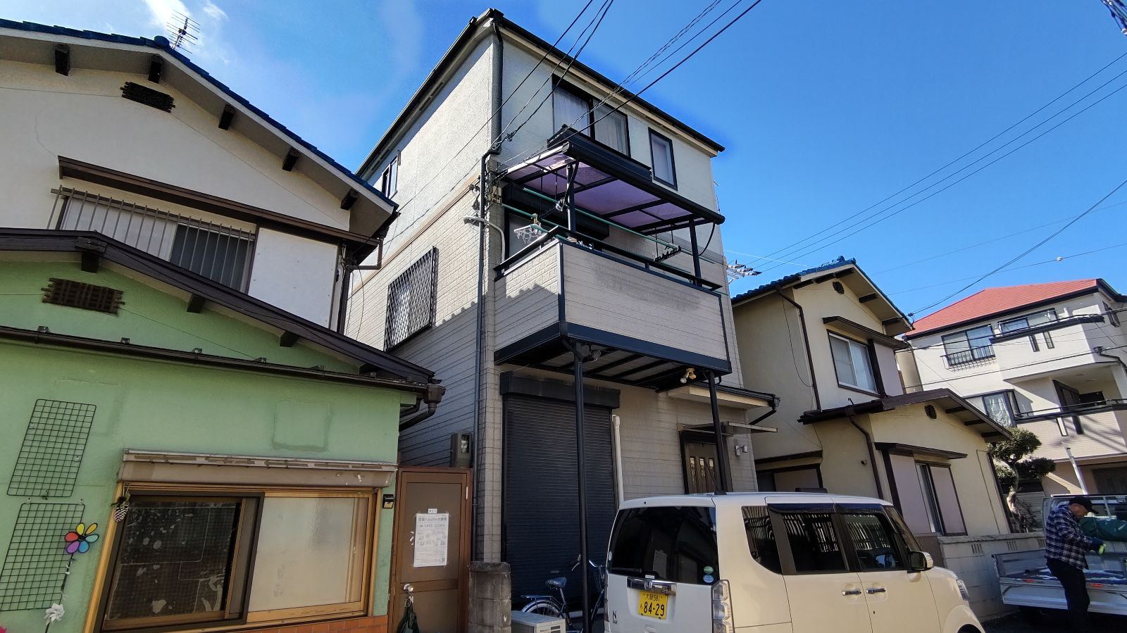 現場は築15年以上が経過していると思われる3階建ての戸建住宅で、道路面に面した外観は一見きれいに見えるものの、細部を見ていくと経年劣化が随所に現れていました。