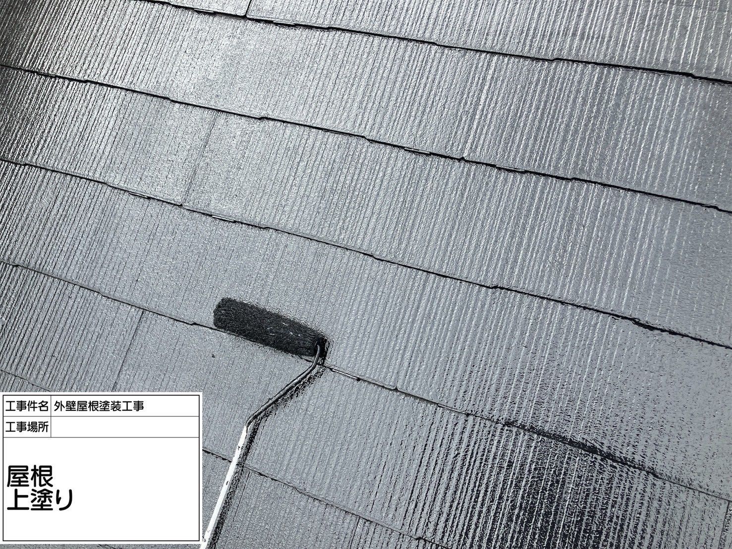 屋根上塗りでは、遮熱性に優れたフッ素系塗料を使用しました。これは太陽光による熱を反射する性能があり、屋根材の劣化を抑制しながら、夏場の室内温度上昇も軽減してくれる非常に機能的な塗料です。