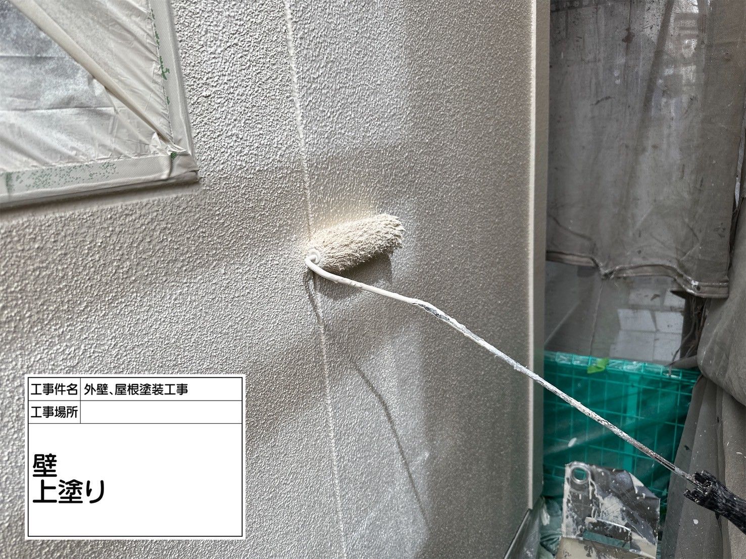 今回の外壁は、吹付けリシン仕上げの外壁面に対し、シリコン系高耐候性塗料で上塗りを行いました。中塗りで形成された塗膜にさらに重ねて塗ることで、色ムラのない均一な塗装面を形成します。
