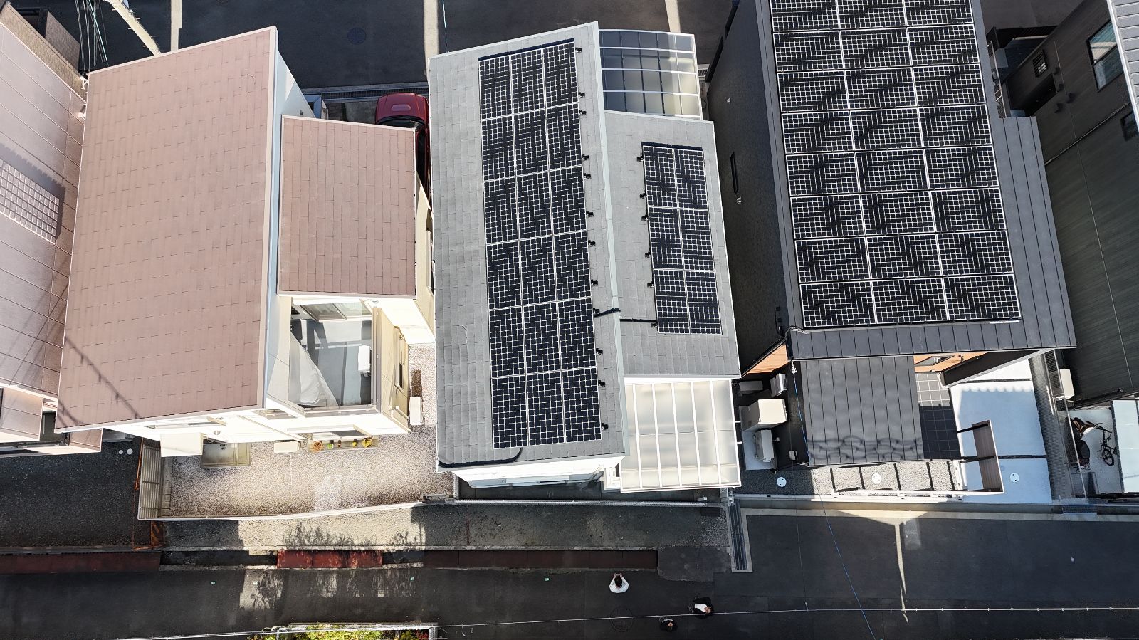 本日は、大阪府茨木市下中条町にて屋根塗装工事のご依頼をいただき、現地調査を実施してきました。今回はドローンによる上空からの撮影を用い、高所作業の安全性と調査精度を高めて対応しております。現場には午前9時ごろに到着。茨木市内の住宅街の一角に建つ、3階建ての戸建住宅で、太陽光パネルが設置されている特徴的な屋根でした。