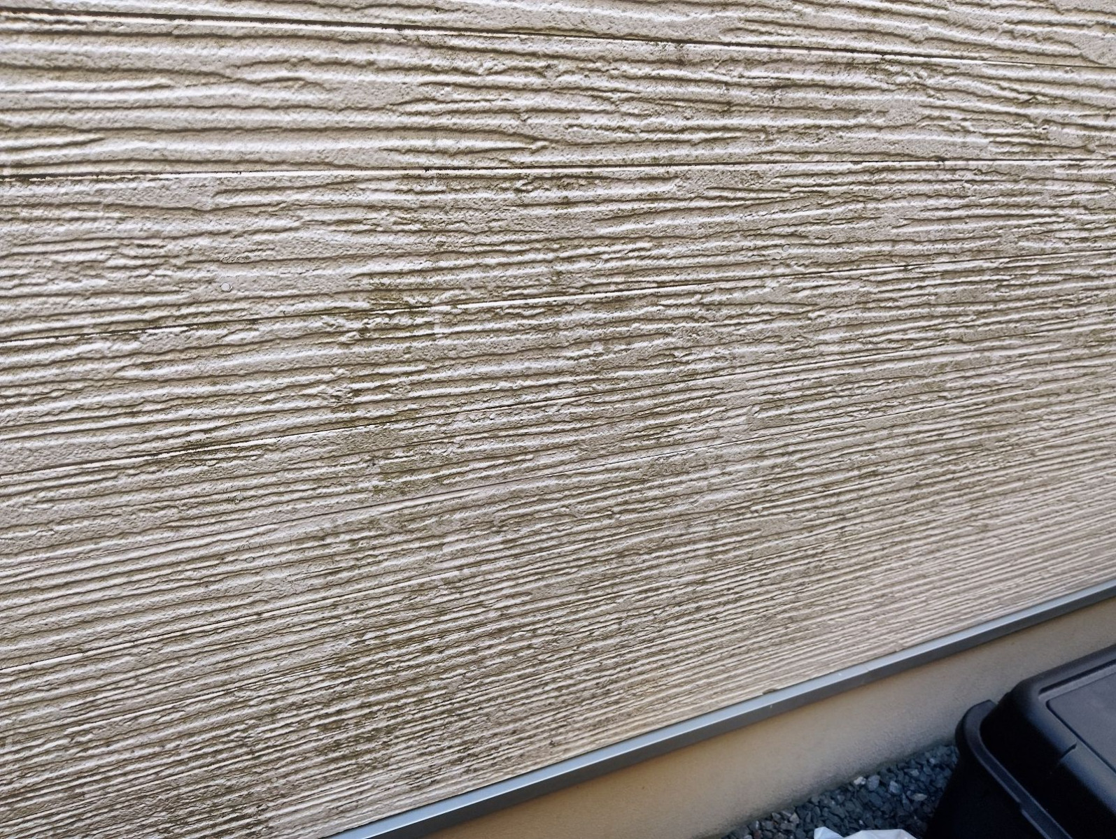 まずは目視にて外壁を確認。外壁はサイディング仕上げで、日当たりの良い南面にてチョーキング現象(白い粉が手につく現象)と、一部コケの付着が確認されました。表面の撥水性が失われ、防水性が著しく低下している状態です。