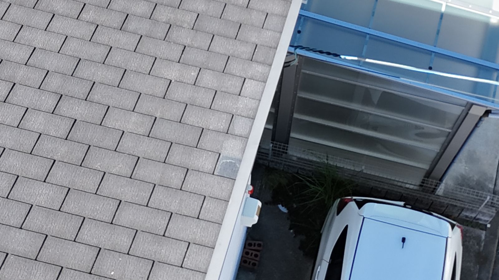 屋根はスレート系屋根材(カラーベスト)でしたが、表面の色褪せと一部に浮きが確認されました。特に屋根の北側では、日照時間が短いため苔の発生が見られ、雨水の滞留によって吸水性が高まっている状態でした。スレート自体は薄い素材のため、吸水と乾燥を繰り返すと反りや割れを引き起こす可能性が高まります。