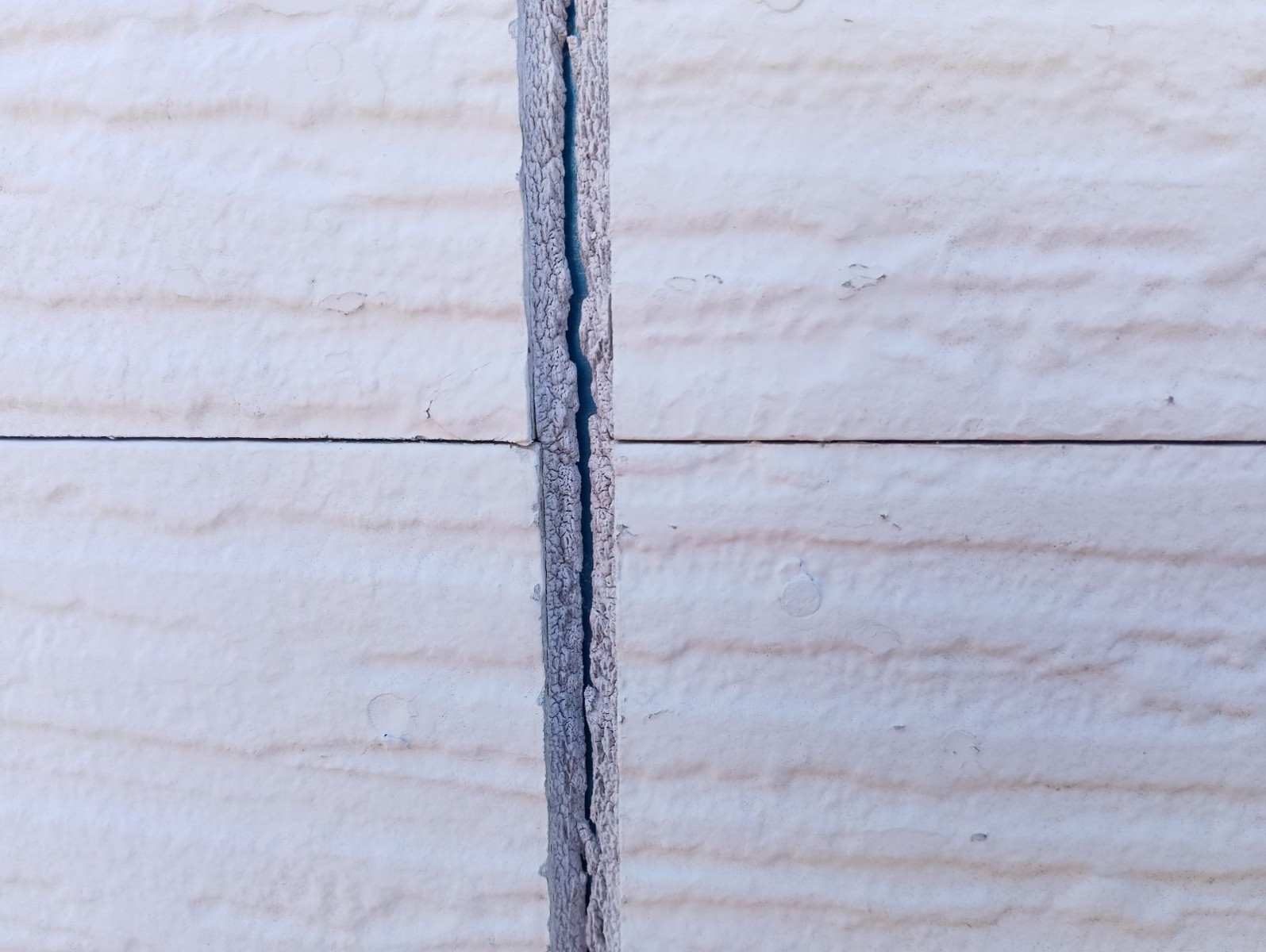 また、写真にあるような目地のひび割れは、経年によってシーリング材が硬化し、伸縮性を失ったことが原因です。目地の開口部分から雨水が侵入すると、外壁の内部構造に腐食やカビの発生を引き起こし、見た目以上に深刻なダメージを及ぼします。