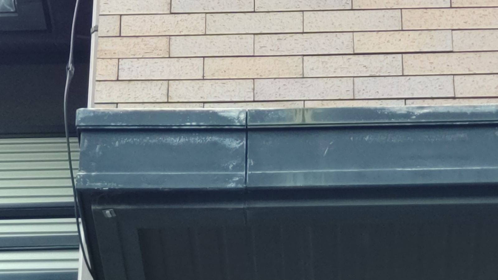 屋根や外壁の調査と並行して確認したのが、付帯部である雨樋や破風板の状態です。写真にあるように、雨樋と壁の取り合い部分ではシーリングの劣化が進んでおり、特に雨が吹き込む角度では水の侵入が心配される箇所がいくつか見受けられました。破風板の塗膜も一部剥がれており、経年劣化によって木部が湿気を含みやすい状態になっています。