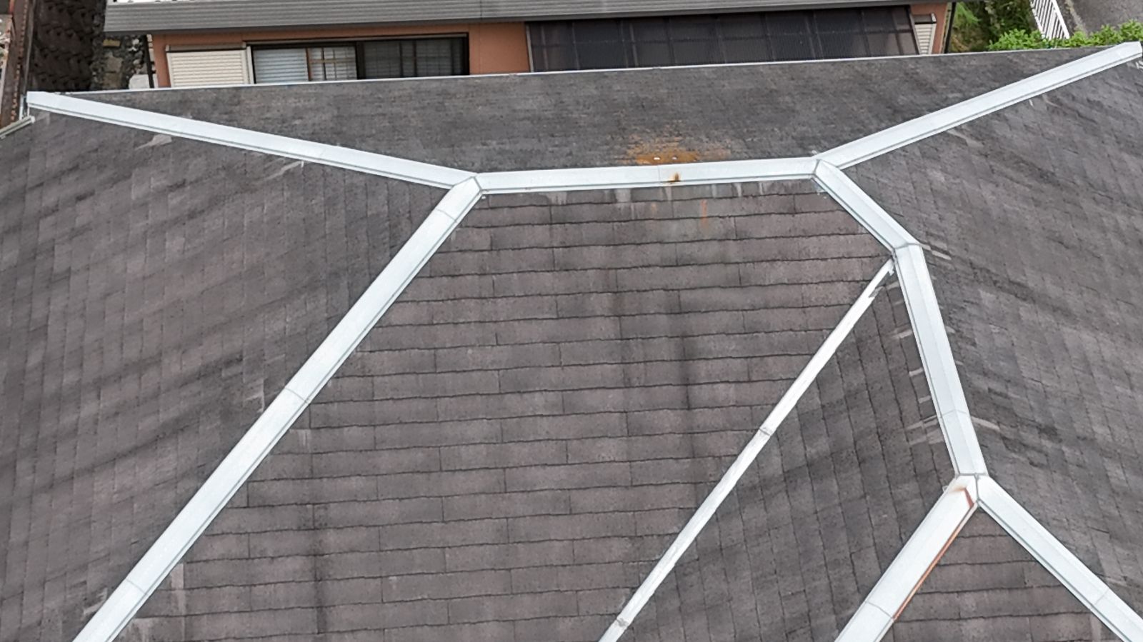 次に屋根をドローンで確認したところ、全体的に色褪せと雨染みのような模様が出ており、塗膜の防水機能が落ちていることが明白でした。特に谷部には汚れの集中があり、雨水の排水効率の低下も懸念されました。加えて、雨樋の取り合い部には隙間やシーリングの劣化が見られ、小雨でも水が入り込むリスクがある状態でした。