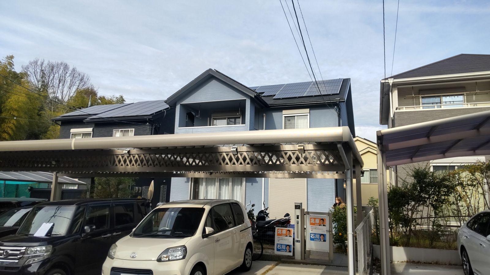 太陽光パネルは年数が経つと表面の汚れや埃、鳥の糞などが付着し、発電効率が大幅に落ちる場合があります。特に井口台のような樹木の多い地域では、落ち葉や苔の付着も要注意です。そのため、屋根塗装工事の際に足場を設置するこのタイミングで、パネル表面の洗浄と架台部分の固定状態のチェックを同時に行うことをご提案しました。