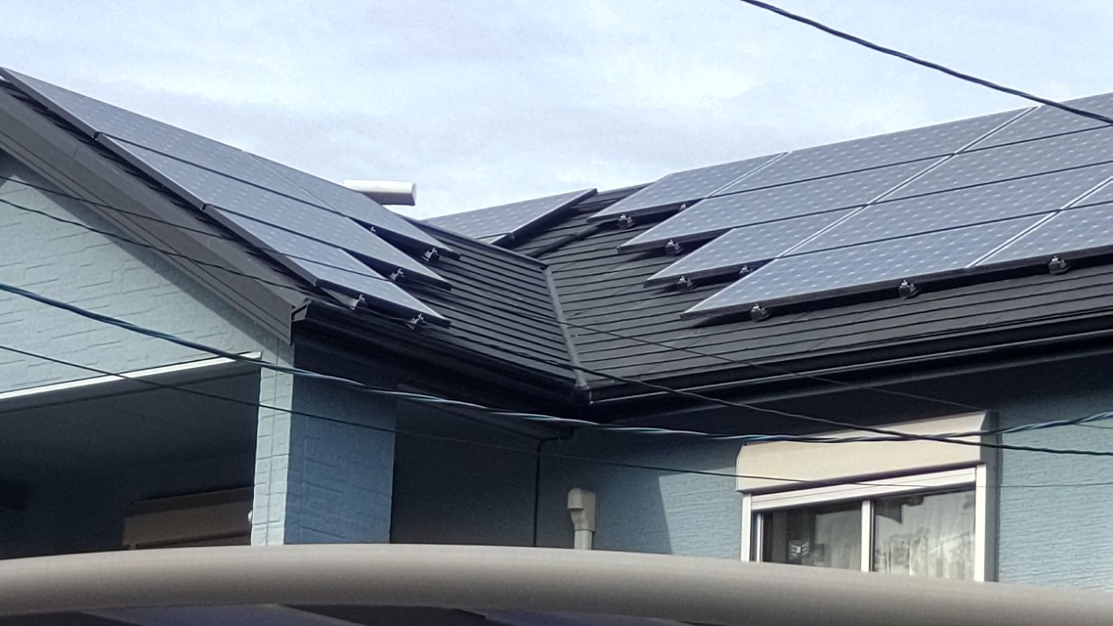 現場に到着して最初に目を引いたのは、屋根全面に設置された太陽光パネルの存在でした。非常に綺麗に配置されており、設置年数が比較的新しいことが伺えます。しかし、屋根材自体には経年劣化による色褪せや微細なひび割れが見受けられ、今後の防水性や耐久性を考慮すると、早めの塗装メンテナンスが必要と判断しました。