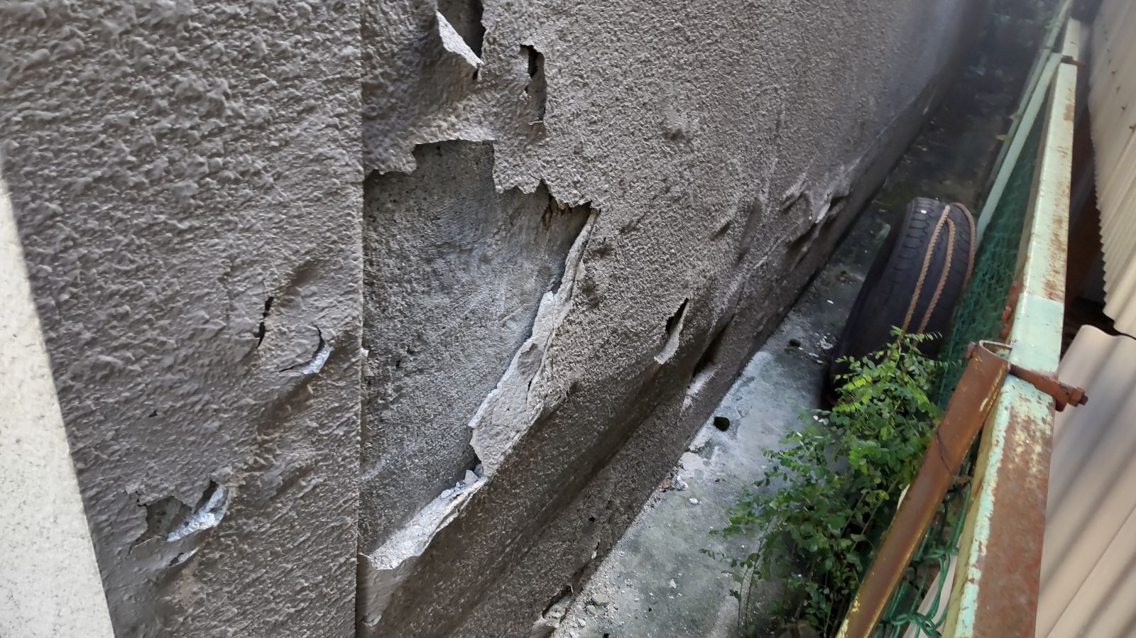 今回の工事では、外壁のモルタル補修を行い、浮きや剥離部分をすべて撤去。その後、下地調整と防水塗装を実施する予定です。