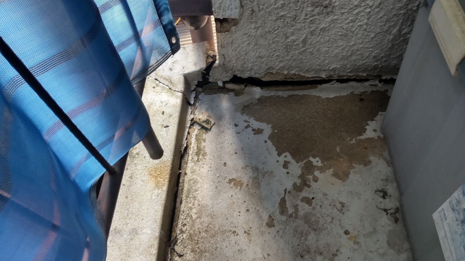 また、ベランダの立ち上がりや壁際にはひび割れやシーリング材の劣化も確認。そこからも雨水が侵入している痕跡があり、早急な補修が必要な状態です。