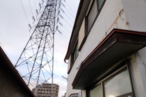このたびは、大阪府門真市寿町にある築年数の経過した木造2階建て住宅にて、外壁塗装と屋根葺き替え工事のための現地調査を実施しました。現場へは京阪電車の古川橋駅から徒歩で向かい、駅近ながらも電線鉄塔の目立つ住宅街の一角に位置するお宅でした。住宅は敷地内にゆとりが少なく、隣家との距離が近いため、足場設置時の配慮が必要と感じながらの現地入りとなりました。