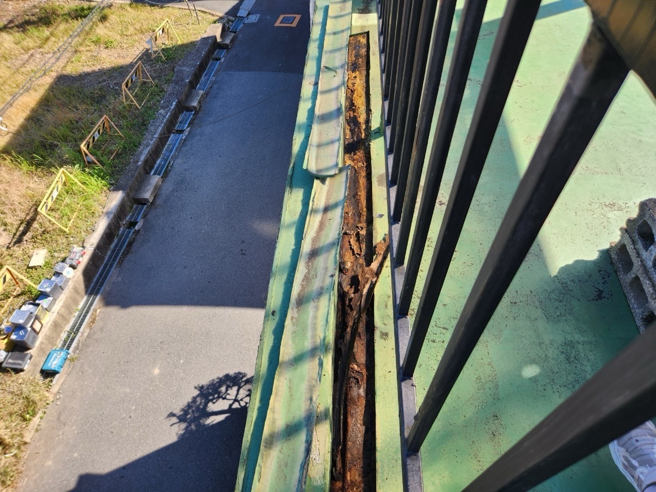 今回の現地調査で最も深刻だったのは、ベランダ手すり下に設置されていた鋼製笠木の著しい腐食です。写真をご覧いただくとわかるように、笠木内部に大きなサビ穴が開いており、その部分から雨水が内部に侵入している形跡が確認できました。このまま放置すれば、雨水が柱内部にまで流れ込み、構造材の腐食や室内への漏水リスクが高まる危険があります。