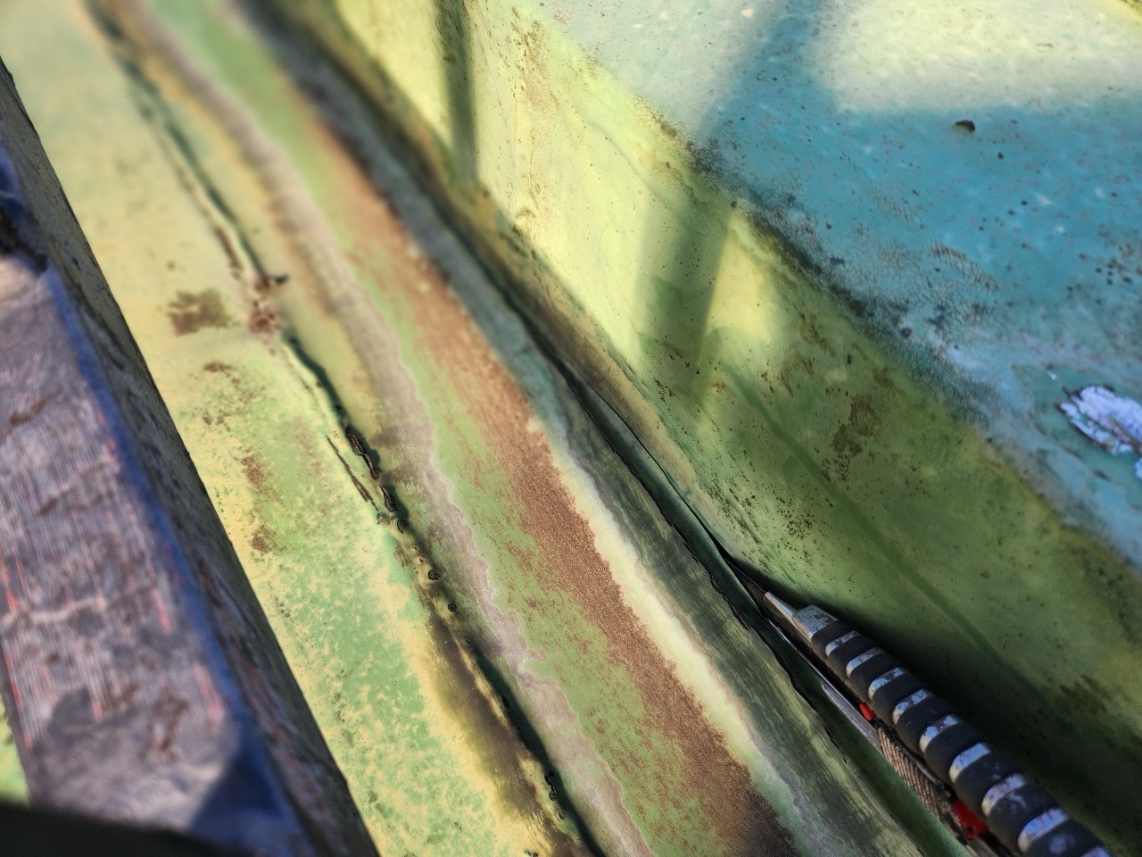 現地に到着してまず目についたのは、ベランダ手すり下にある鉄部の腐食と、長年放置されたと思われる防水層のひび割れです。特にベランダの立ち上がり部分には水が溜まりやすい構造になっており、防水層の劣化から雨水が浸入したことで、下地鉄部にまでサビが進行していました。撮影した写真からも確認できるように、鋼製笠木の内部は腐食が激しく、一部には穴が開いている箇所も見受けられました。