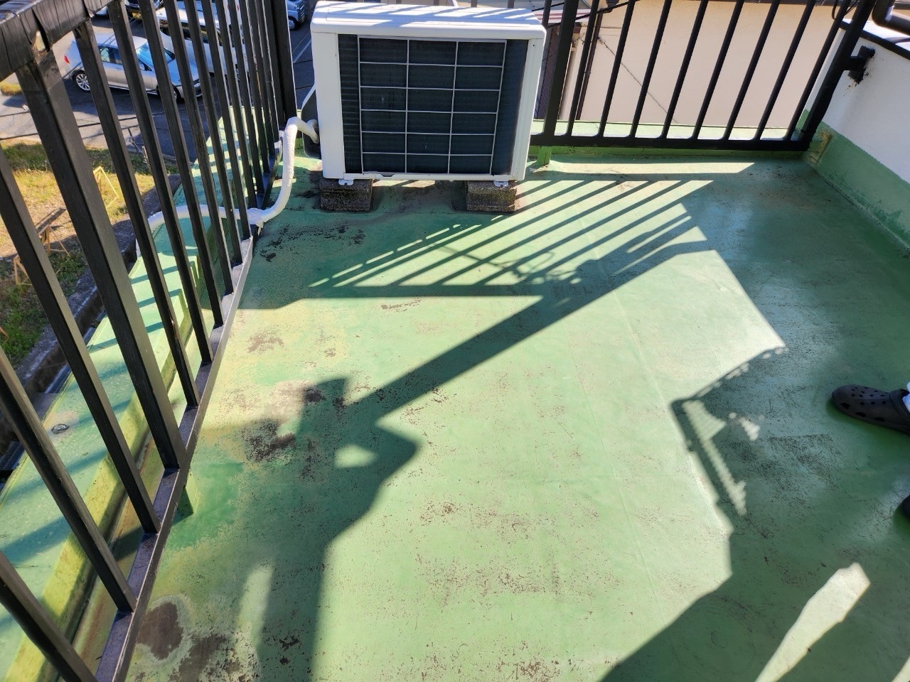 塗膜防水がメインの施工だったようで、塗料の剥がれが部分的に進行しており、下地が露出している箇所もありました。こうした状態では、雨が降るたびに水がしみ込み、内部の木材や鉄部にダメージを与え続けてしまいます。実際に、写真に映っているエアコン室外機の下にも防水塗膜の浮きが確認されており、将来的な雨漏りリスクが懸念されます。