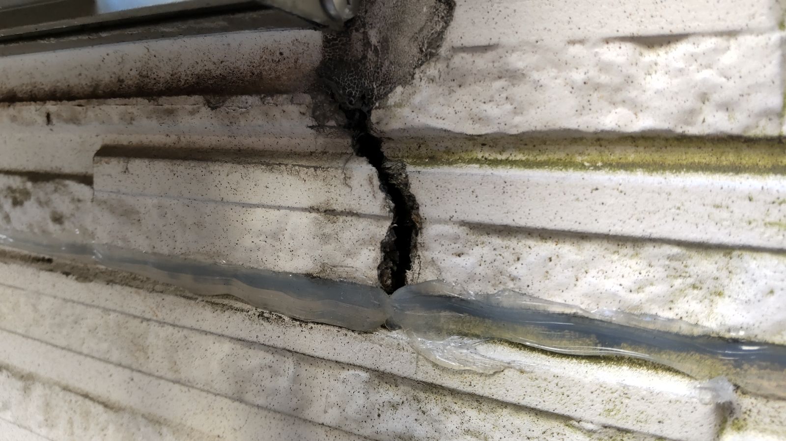 一般的な経年劣化であれば、塗膜のひび割れにとどまることが多いですが、今回のクラックは深さ・幅ともに顕著で、外壁材自体の劣化が進行していると考えられます。既存のコーキング材も劣化しており、再充填ではなく、一度既存材を撤去してから新たに打ち直す「打ち替え工法」が必要となります。