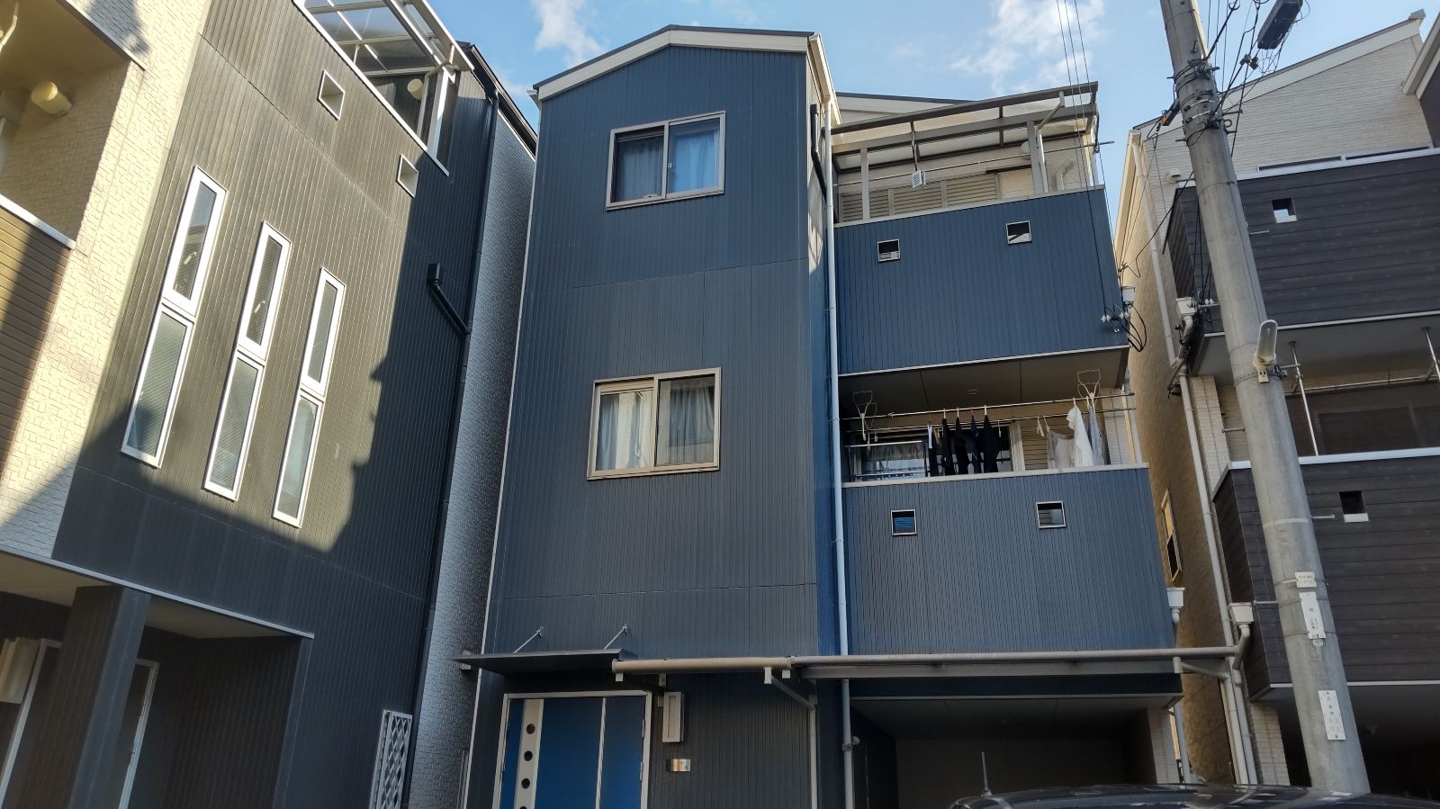 調査対象の住宅は、築15年以上と思われる3階建ての戸建て住宅です。外観はネイビー系の外壁で、全体的に落ち着いた印象ですが、近づいて確認するといくつかの深刻な劣化が確認できました。
