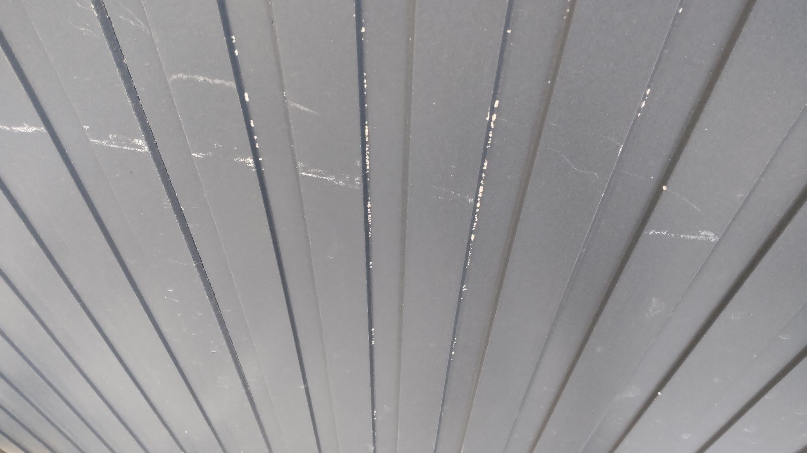 次に、軒天や屋根の調査結果ですが、こちらも注意が必要なポイントがいくつか見受けられました。軒天には複数のヘアクラック(細かなひび割れ)が発生しており、塗膜の浮きや剥離も確認できました。このまま放置してしまうと、下地材にまで水が浸透し、最悪の場合、腐食やカビの原因となります。