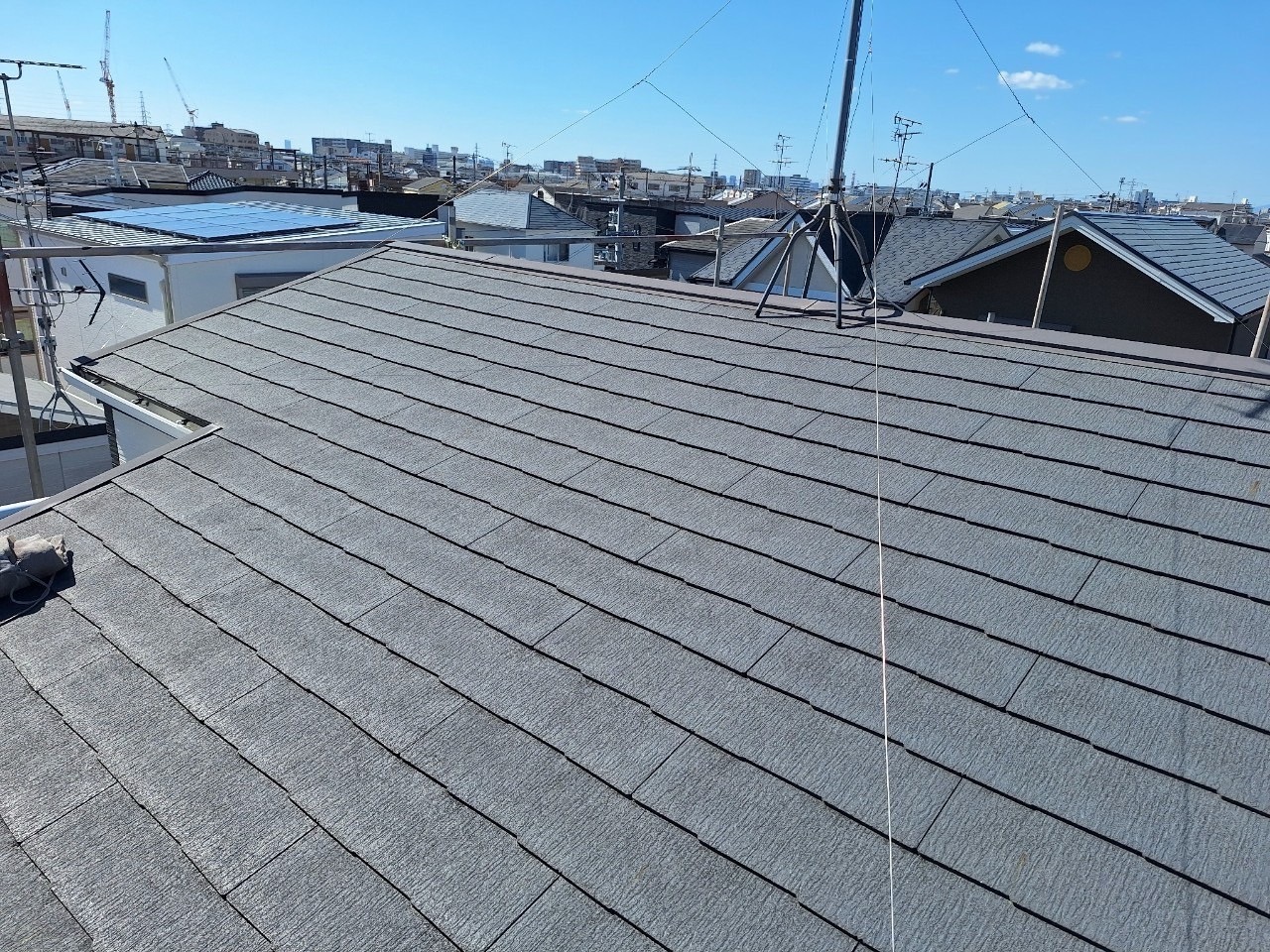 屋根塗装には下地との密着性が重要で、まずは丁寧な高圧洗浄を行い、塗膜の残骸や汚れをしっかり落とすことが肝心です。その上で、シーラー(下塗り材)を使って吸い込みを防止し、中塗り・上塗りと工程を重ねていきます。今回は耐候性の高いラジカル制御型塗料や遮熱効果のある塗料を選択肢に入れて、お客様にご提案予定です。