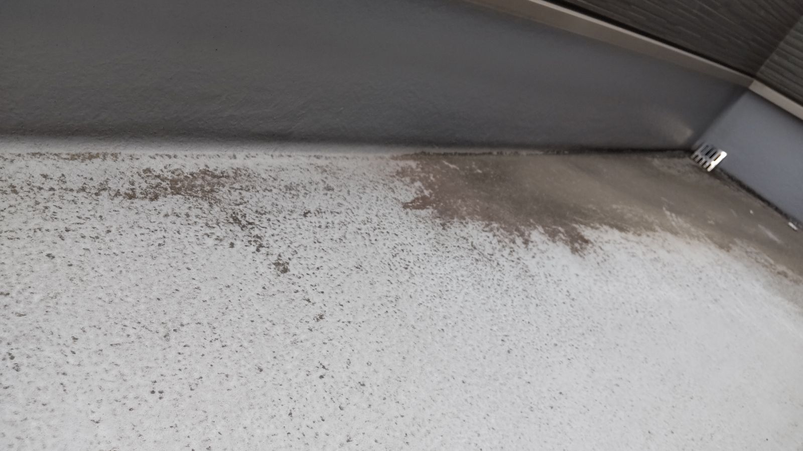 ひび割れ箇所は防水性も損なっており、周辺のモルタルに白華現象(エフロレッセンス)も若干確認されました。これは内部から水分が染み出してきた証拠であり、防水層の劣化が進んでいる可能性を示しています。今後の塗装工事では、まず下地補修をしっかりと行い、ひび割れをUカット工法などで処理したうえで、浸透性の高い下塗り材を使用する必要があります。
