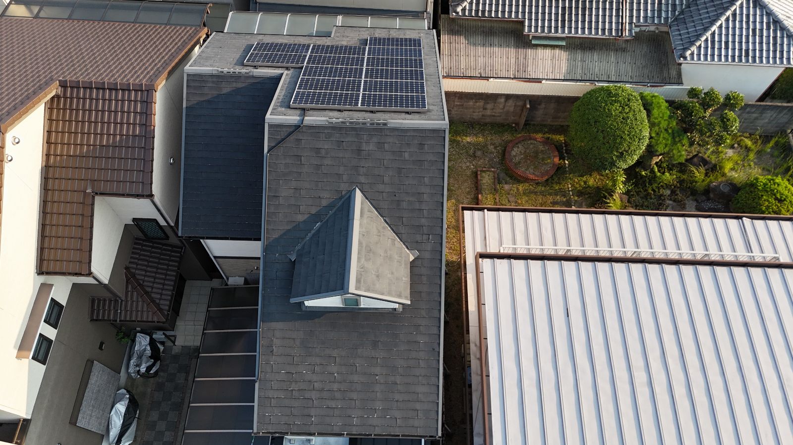 屋根の調査にはドローンを使用し、建物の真上から撮影した全体像を確認しました。屋根材の色褪せが進行しており、防水性能の低下が明らかでした。また、太陽光パネルの設置箇所に付着した苔や汚れも確認され、雨水の流れが滞る危険性があります。これは放置すれば排水不良による雨漏りやパネルの発電効率低下につながるリスクがあります。