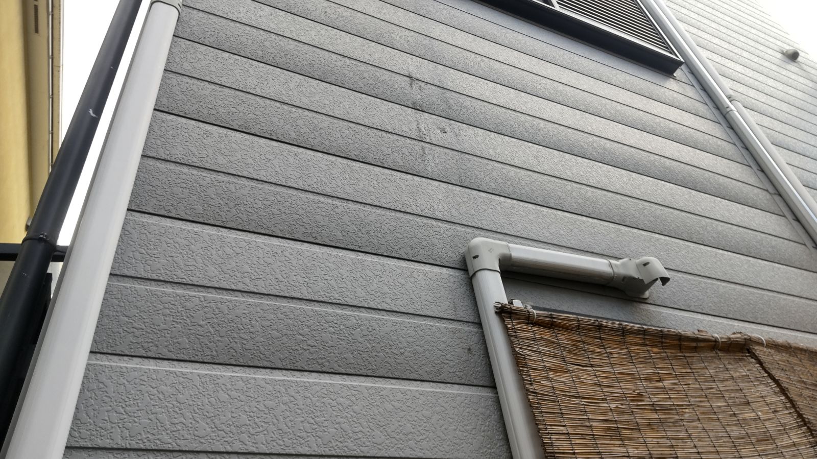 外観は一見すると大きな損傷は見受けられませんが、細かく観察すると経年劣化の兆候が複数確認できました。写真にもあるように、外壁はサイディングボード仕上げで、一部にチョーキング(手で触れると白い粉が付く現象)が発生しており、防水性の低下が疑われます。また、外壁表面には色むらや雨だれのような跡もあり、美観の面でもやや気になる状態です。