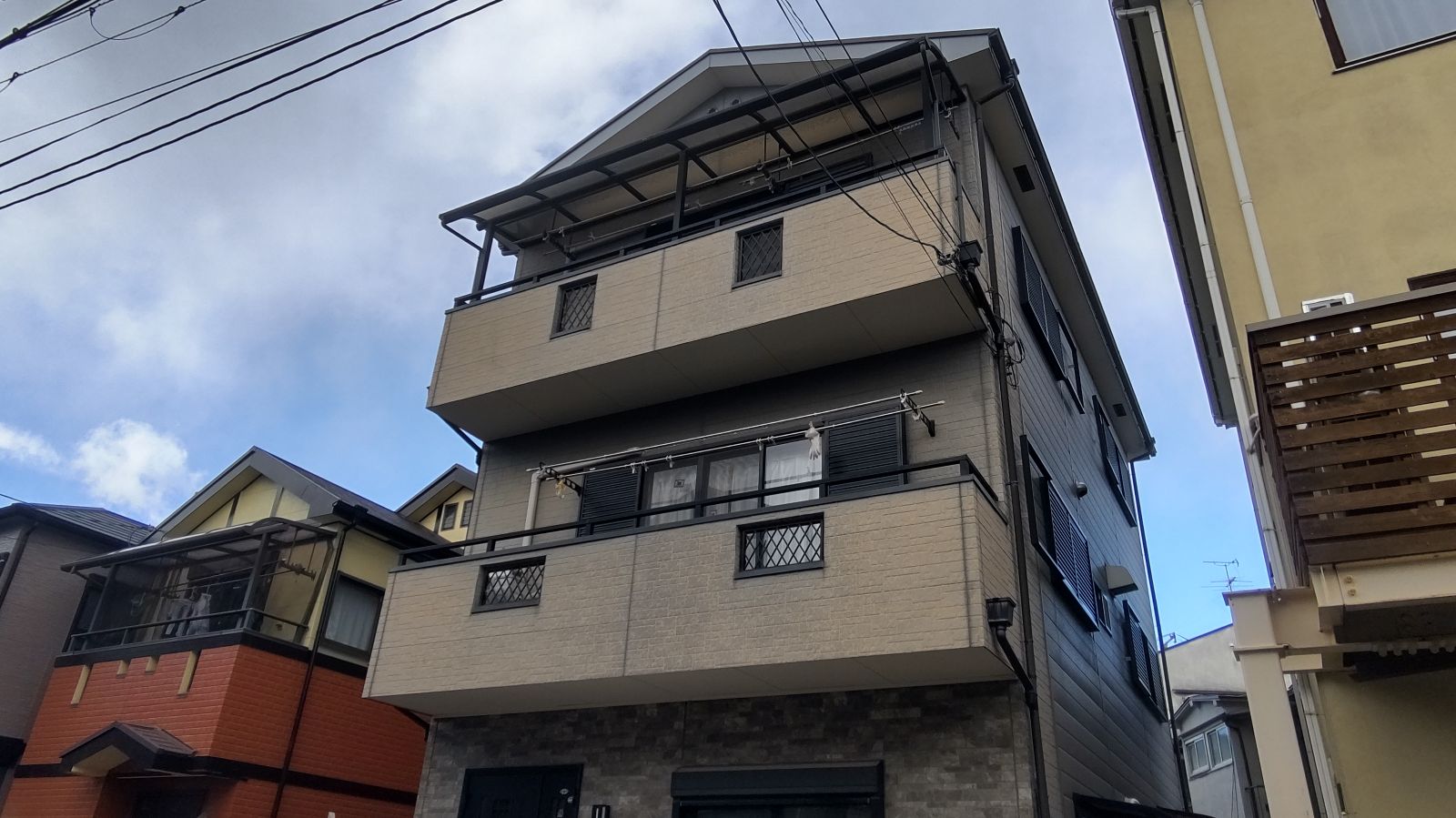 今回の現地調査は、大阪府寝屋川市池田にお住まいのお客様からのご依頼でした。「外壁と屋根の色褪せが気になってきた」とのことで、塗り替えのタイミングを見極めたいというご相談です。秋晴れの空の下、私は京阪寝屋川市駅から自転車で向かいました。閑静な住宅街の一角にある3階建ての戸建住宅で、築15年以上は経過している印象を受けました。