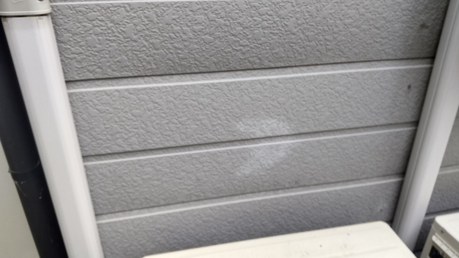 今回の住宅では、南面および西面に特にチョーキングが強く出ていました。これらの方角は日照時間が長く、紫外線の影響を強く受けるため、他の面よりも早く劣化が進みやすいのです。触ってみると、手のひらにしっかりと粉がつくレベルであり、塗膜の防水性はすでにかなり低下していると判断できます。