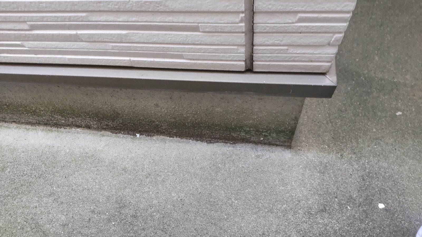 外壁表面に黒ずみや汚れが見られました。これは塗膜が劣化し、防水性能が低下してきているサインです。サイディング外壁は元々水を吸い込みやすい素材であるため、塗膜が健全なうちは雨水を弾いてくれますが、経年によって防水効果が薄れると、水分が徐々に内部に浸透し、カビや藻の繁殖を促してしまいます。
