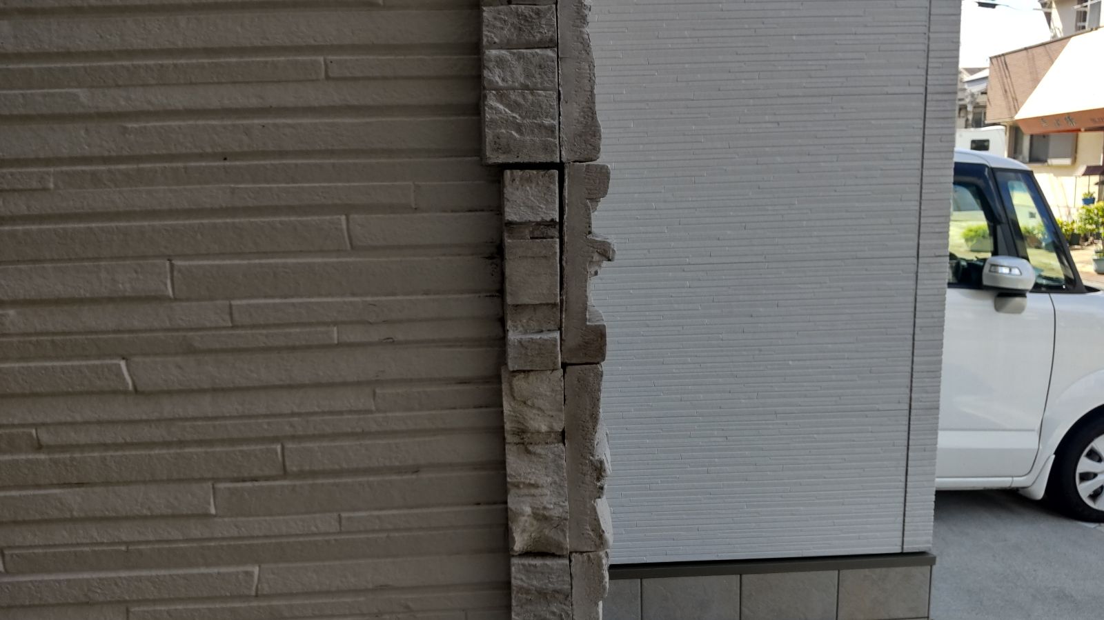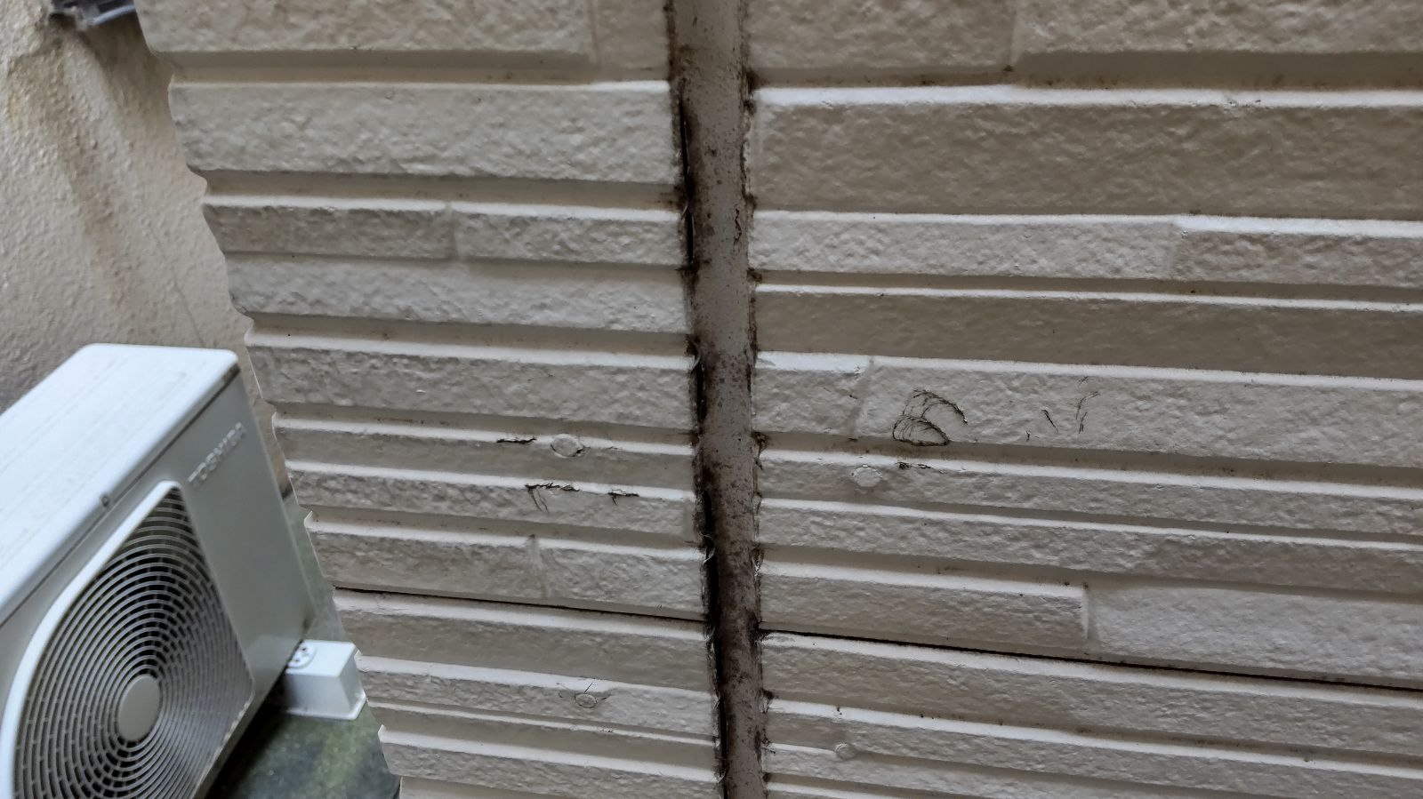 今回の寝屋川市石津中町の住宅において最も深刻だったのが、コーキング(シーリング)の劣化です。縦目地部分のコーキングが完全にひび割れ、中央部分では剥離が進行していました。このような状態になると、雨水が直接外壁材の裏に回り込み、サイディング材自体を劣化させる大きな原因になります。