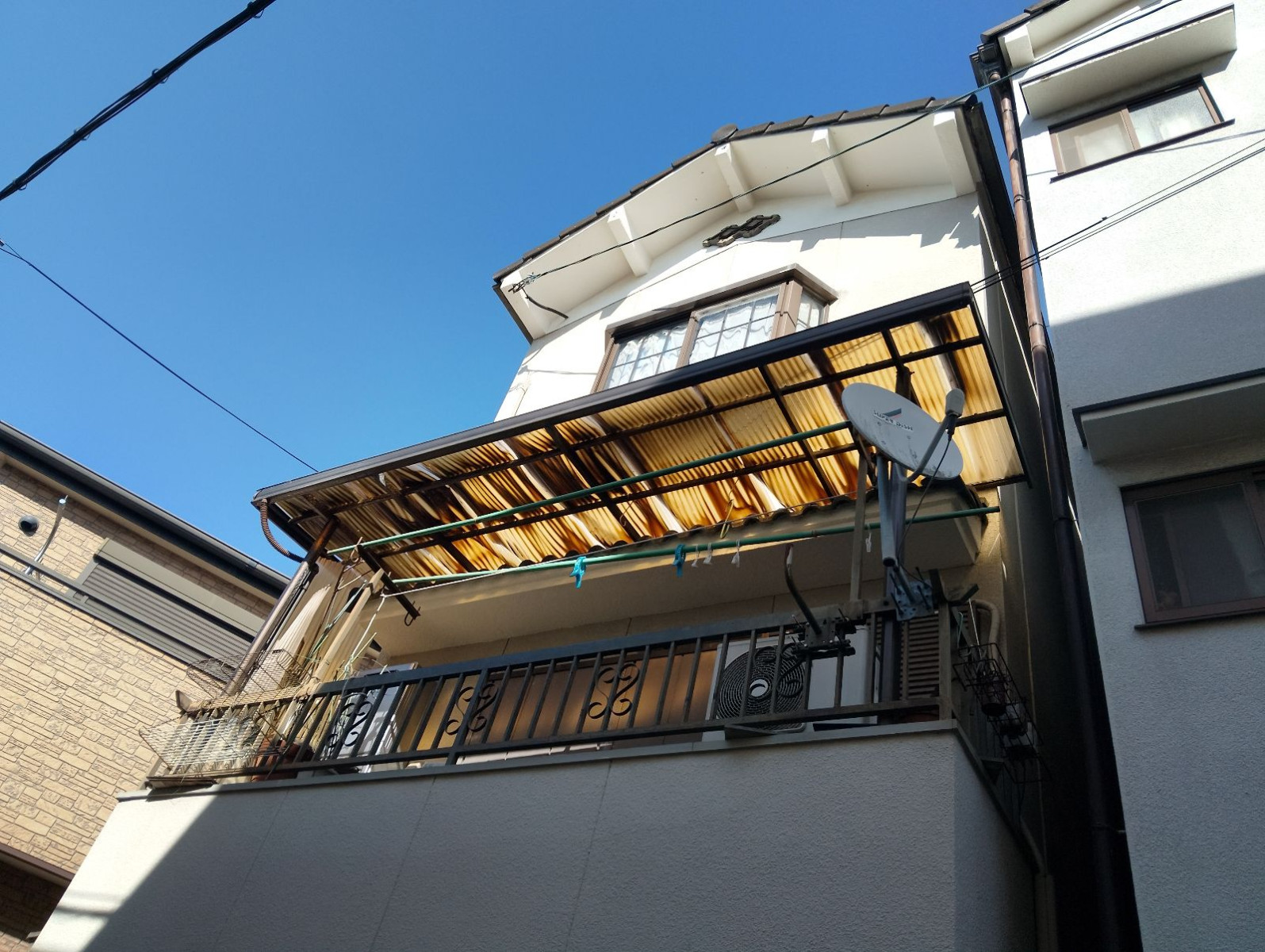 バルコニー屋根に設置された波板には変色・変形が見られました。これは紫外線や雨風の影響による劣化であり、特に強風時には飛散の恐れもあるため、早期の張替えが推奨されます。