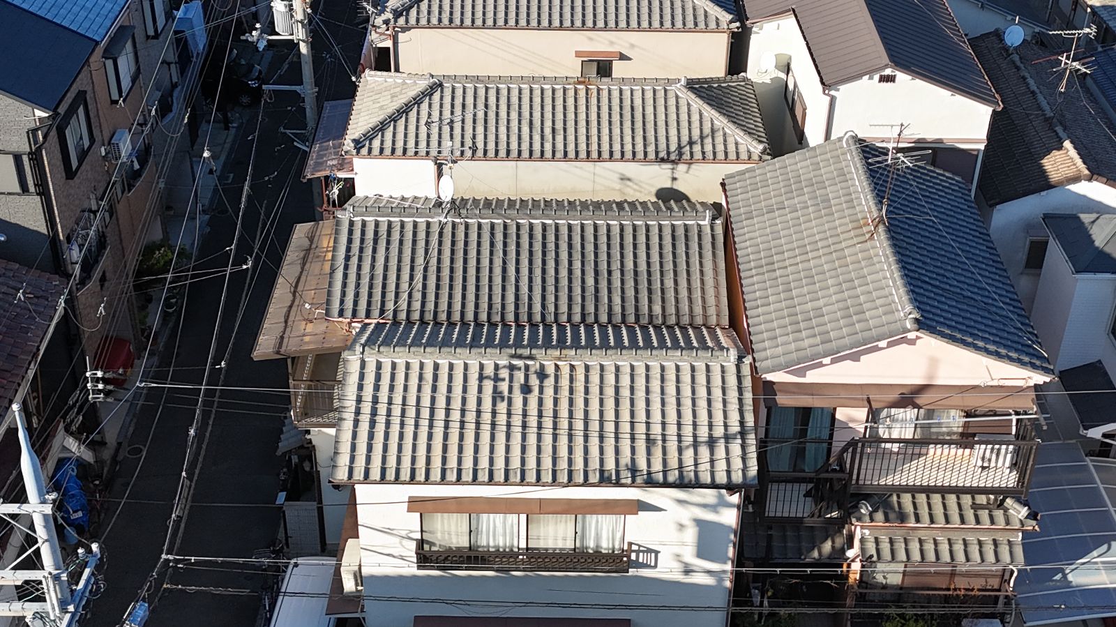 今回の工事では屋根・外壁・バルコニーのすべてにおいて作業を行うため、足場の組立が必須です。特に屋根は勾配がある上、瓦のズレも進行しているため、作業時の安全確保と瓦を破損させない慎重な動線設計が必要となります。