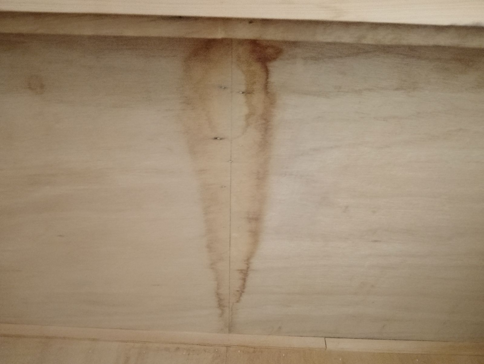 また、屋内の天井裏を点検すると、木材にしっかりと雨染みの痕跡があり、雨漏りが進行していることが判明。天井板に染みが広がっており、建物内部への浸水が懸念されます。